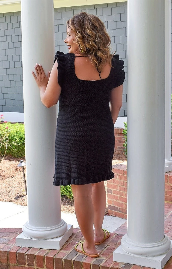 Every girl needs a little black dress in her closet and this dress is sure to turn heads! We love the slimming look of this dress with the ruffled sleeves adding a statement touch! This dress is perfect for endless occasions, hurry and make it yours!Â