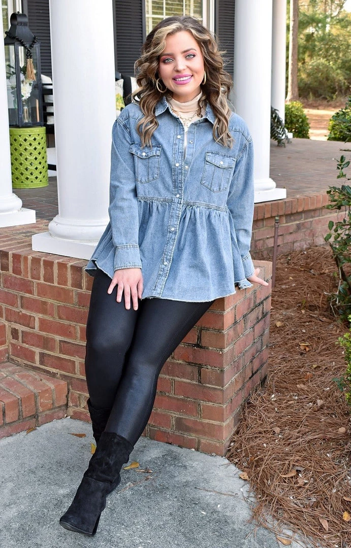 Stay darling in denim no matter how you style this adorable little top that makes as the perfect go to layering piece. This one is more open cut with a design that slightly cinches in at the waist as it then flows down to flatter. We love the way it pairs with our new taupe bodysuit!