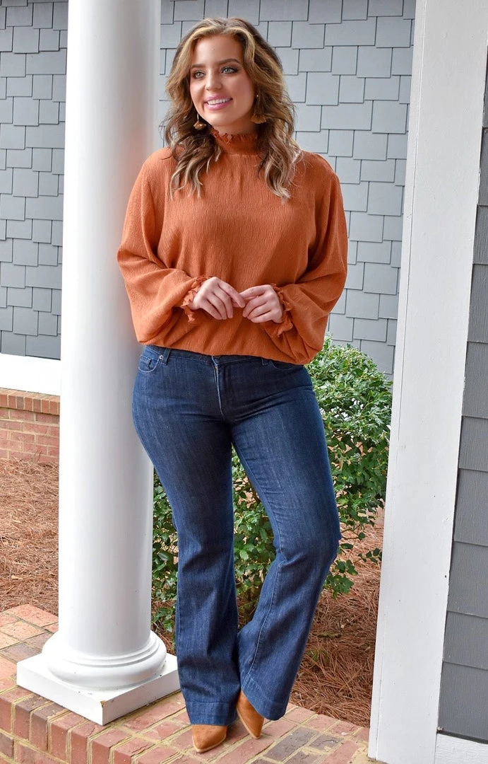 This little terra cotta top is just the perfect little color for pairing with our dark wash jeans. This one has a flowing design with a more open cut sleeve and fitted detailing near the wrist and the neck area to add a pop of flare. Throw on a statement earring and enjoy the endless layering options this one brings!