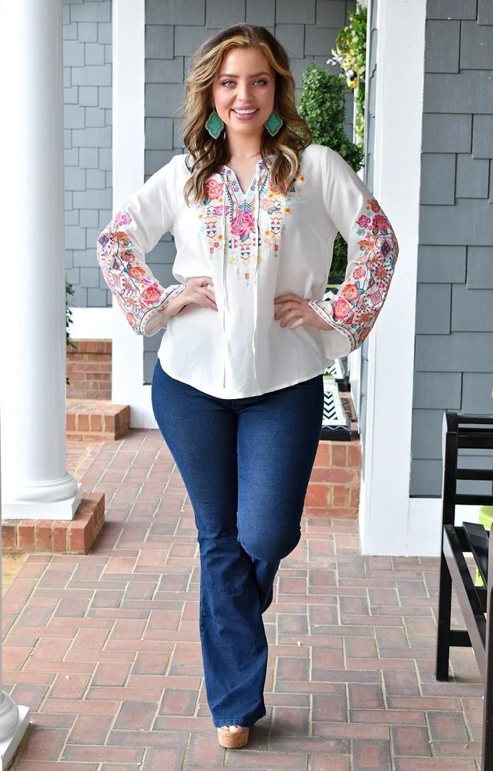 We cannot get enough of this absolutely beautiful top! It features the most eye catching hand embroidered detailing along the front with intricate, vibrant colors that truly make the entire look pop. This one has a flowing fit with no stretch in the actual material, but a more open cut design to glide over your shape to flatter. You are going to love rocking this with our dark wash flare jean!