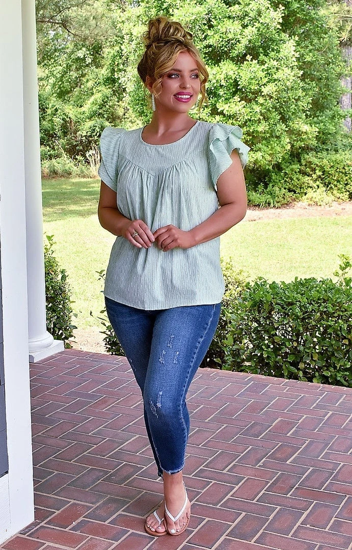 This top features such an adorable and soft mint color with the cutest ruffle design along the sleeves. The dainty print throughout adds an additional pop. There is no stretch in this material, but it does run true to size. You are going to love the endless options this one brings!