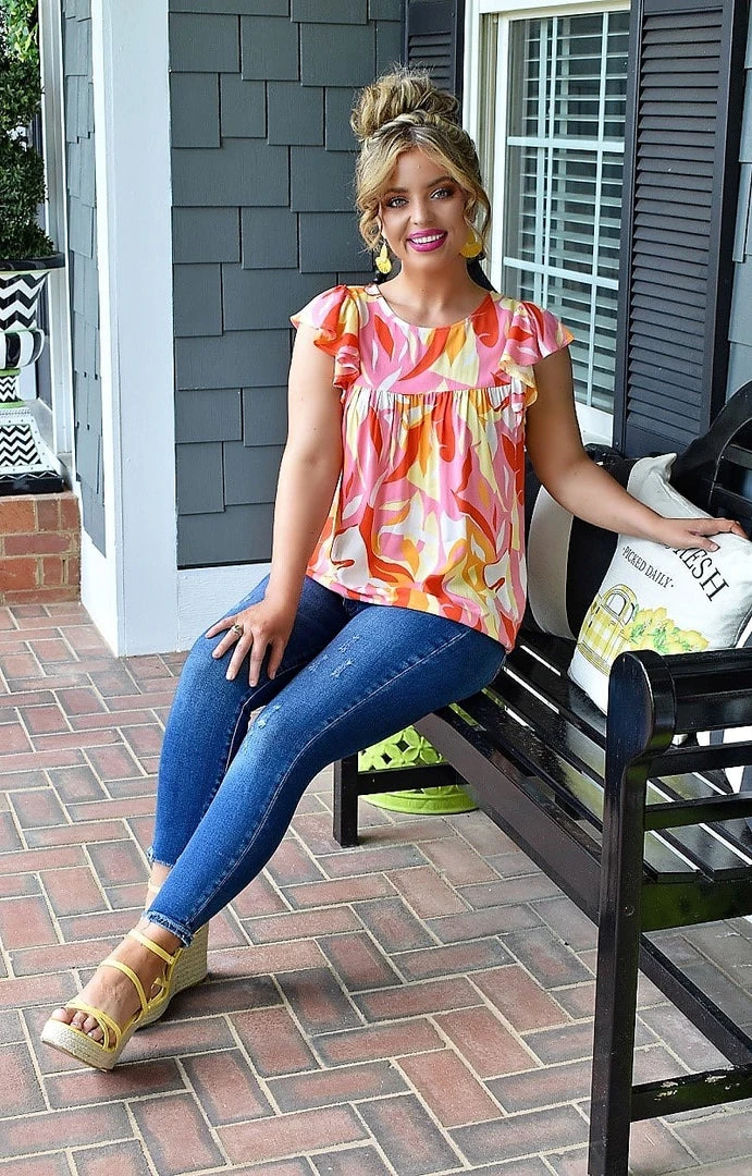 Stand out in style in the most bold and fabulous way this Summer rocking this adorable print top! This beauty features fun pops of colors that just exude Summer time! There is no stretch in the overall material, but this one does have a more flowing cut. The sleeves have such a cute little flare to bring on the drama. Throw this on with your favorite jeans and cute accessories and get ready to turn heads all day!