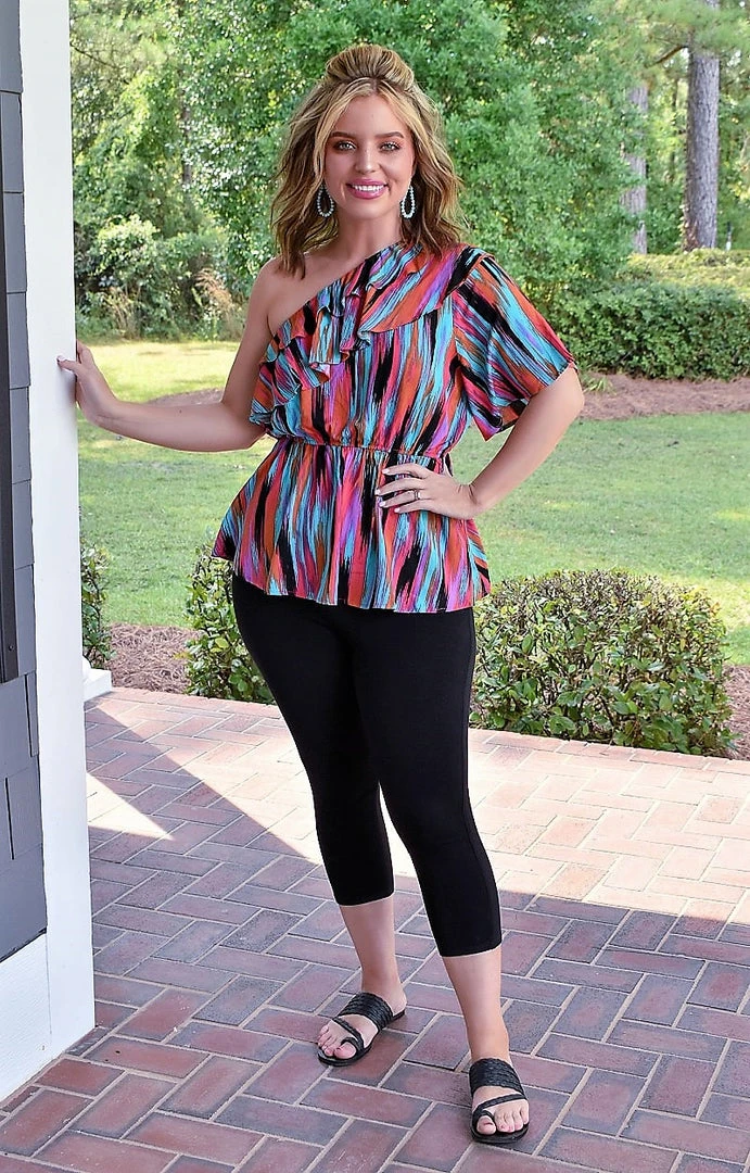 This statement top is so versatile with such a flattering look. This one has a one shoulder design with ruffle layers to add a cute touch. It features an elastic style waistband with a cut that slightly flares out to give that hourglass look. You are going to love this one!