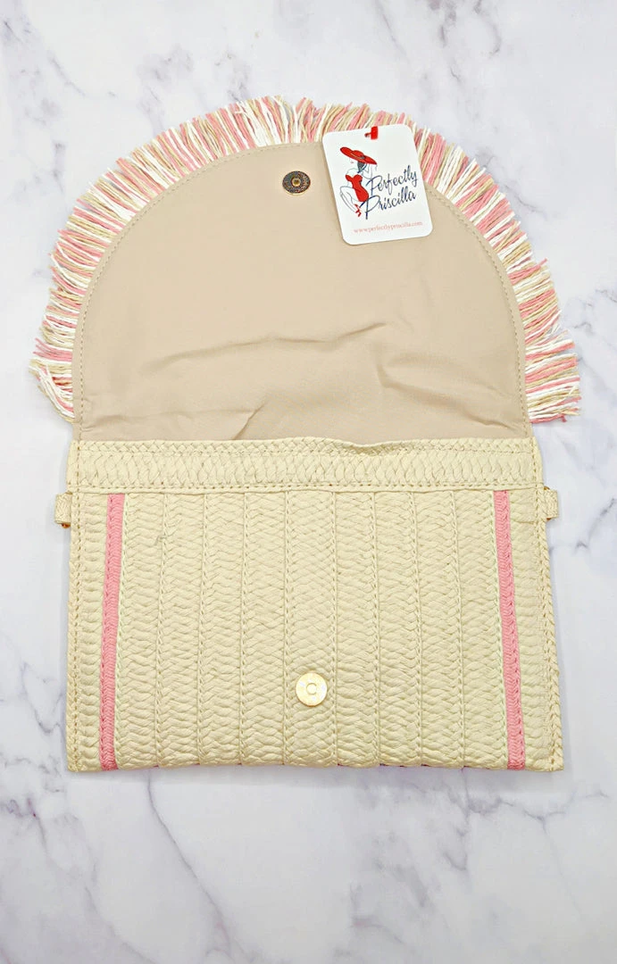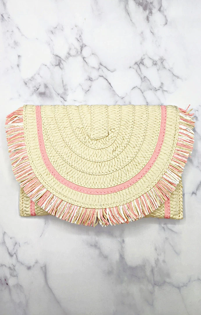 This little clutch is sure to be your favorite go to accessory to pair with so many looks this Summer! It features a lightweight design with the cutest pink and ivory fringe accents along the edge to give it that fabulous boho vibe. You are going to love rocking this with your next PPB look this season!