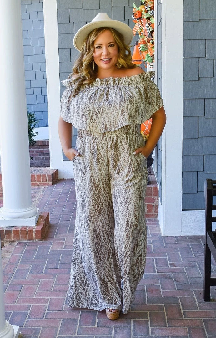 This jumpsuit is so edgy and chic and we are loving the way it pops with our statement hat! This beauty has a more open cut and flowing fit that cascades off the shoulder to flatter. The waistband has a stretchy elastic style detailing to make it conform to your shape to flatter. The legs are also more open cut for a trendy look. You are going to love this one!
