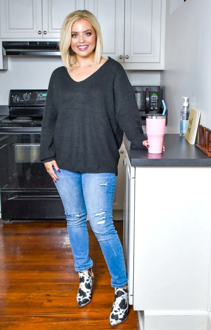 We love a top that makes a statement both coming and going and this one does just that! This one features a deep v-cut neckline along the front with an eye catching v-shaped cutout design in the back with a split panel design. This adds such a chic and unexpected touch to make this one a must have. Dress it up with our new cow print booties and accessories and get ready to look PPB fab!