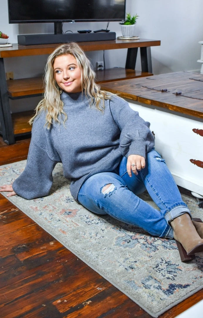 This sweater is so stylish and chic and looks amazing with our new jeans! This one has a thicker style material with a more open cut and stretchy feel. It has a neckline that has a turtleneck style cut that hits more loosely around the neck. The sleeves have a dramatic puff like design to give a stylish flare. They become more fitted as it nears the wrist area to further accentuate the flare sleeve design. Grab yours and get ready to turn heads!