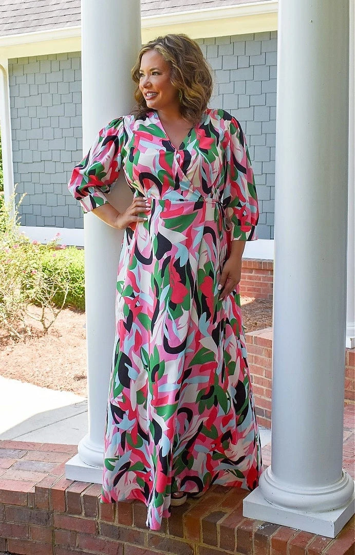 You are sure to be printed to perfection in this beautiful print maxi dress! This stunner features a true wrap style design that makes it custom to your shape to cinch you in like no other. The puff like sleeve adds such a cute pop. This one runs true to size, but does have a banding along the bottom of the upper arm area. Throw this on with your favorite accessories and get ready for all eyes on you!