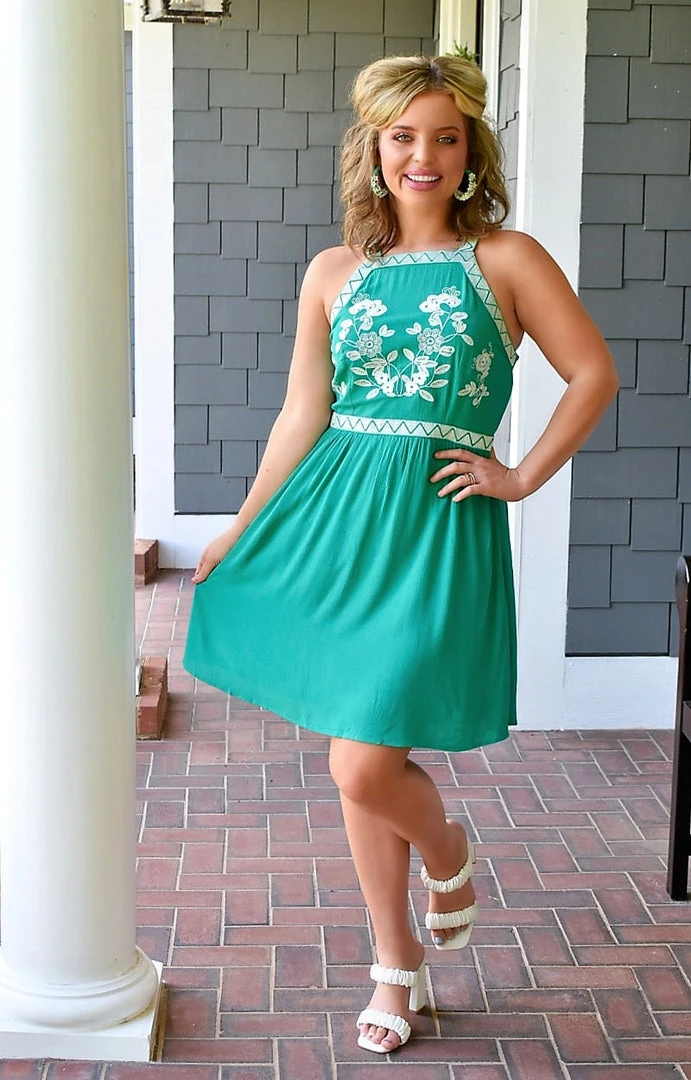 We are swooning over this embroidered dress! It features a stunning kelly green with embroidered accents throughout to make it pop. It cinches in at the waist to truly flatter with a non stretchy material. This one is more fitted near the bust, so if larger in the bust we recommend sizing up one size for the best fit. The back has a cutout design with an invisible zipper. You are going to love this beautiful must have!