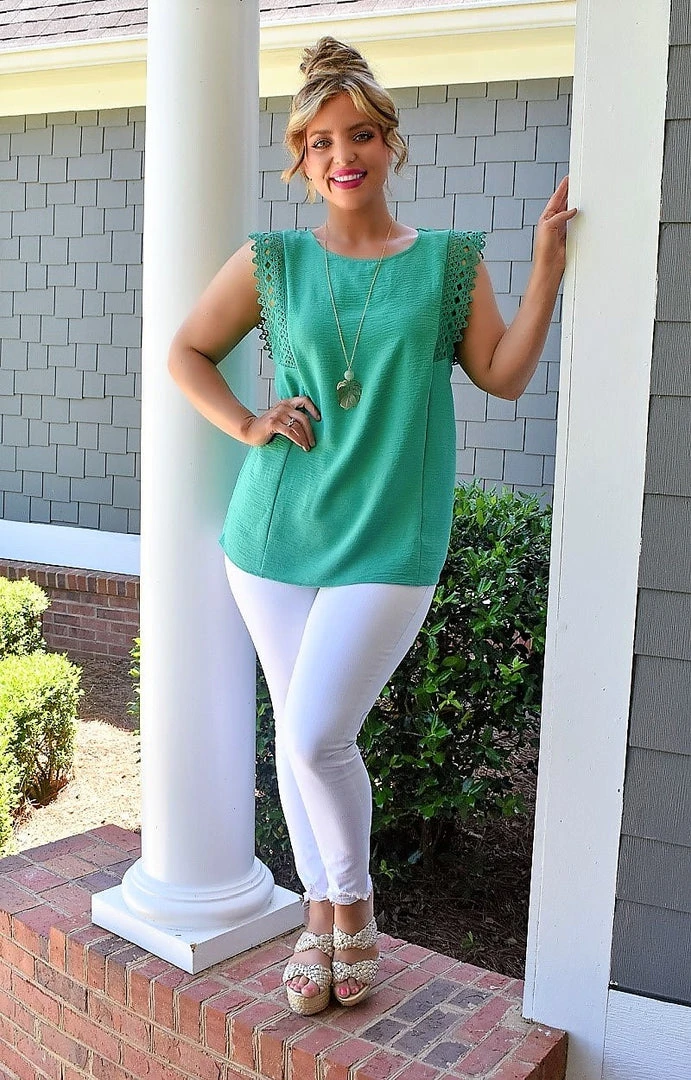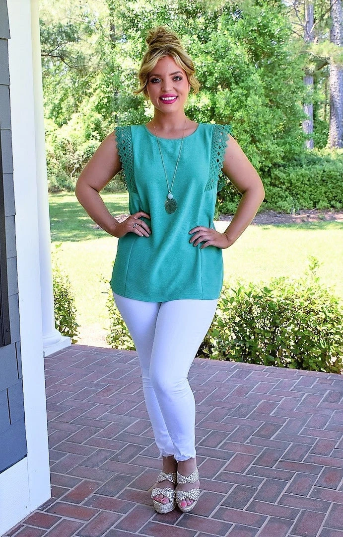 We love this beautiful and classy jade color with lace accents to dress it up. There is no stretch in the overall material, but this one does flow over your shape to flatter. Throw this on with your favorite white pants and get ready to turn heads no matter where you go!
