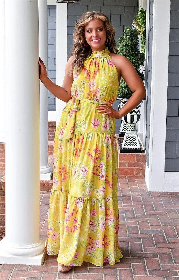 We cannot get enough of this beautiful floral print maxi! This stunning dress is lined with a beautiful floral design of bold colors and vibrant details to set you apart from the rest. This dress features an elastic style waistband with a tie belt to further cinch in your shape as it flows down. It ties around the back of the next for an added cute pop. You need this!