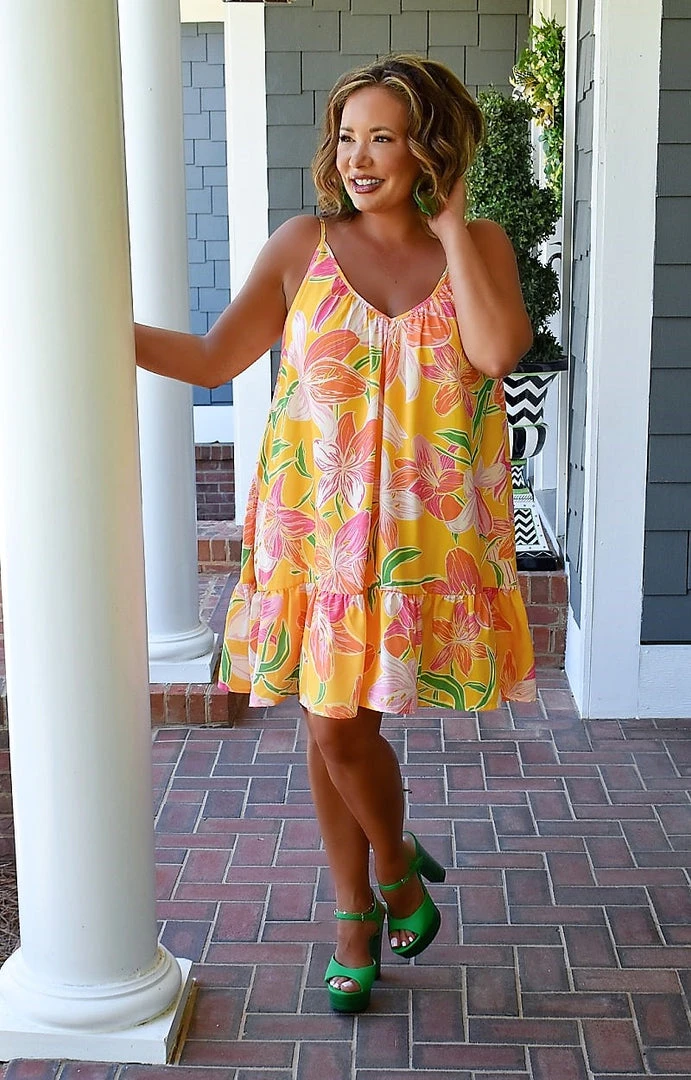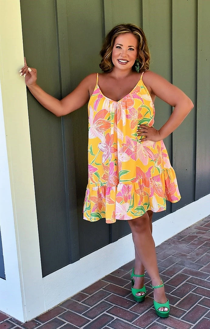 This dress is just what you need to turn heads all season! It features a beautiful bold yellow background with floral print accents to give it that vibrant pop. This one features a flowing and more relaxed cut to glide over your shape as well. This one is fully lined as well to ensure you have ultimate coverage. Throw this on with your favorite go to accessories and get ready to turn heads no matter where you go!