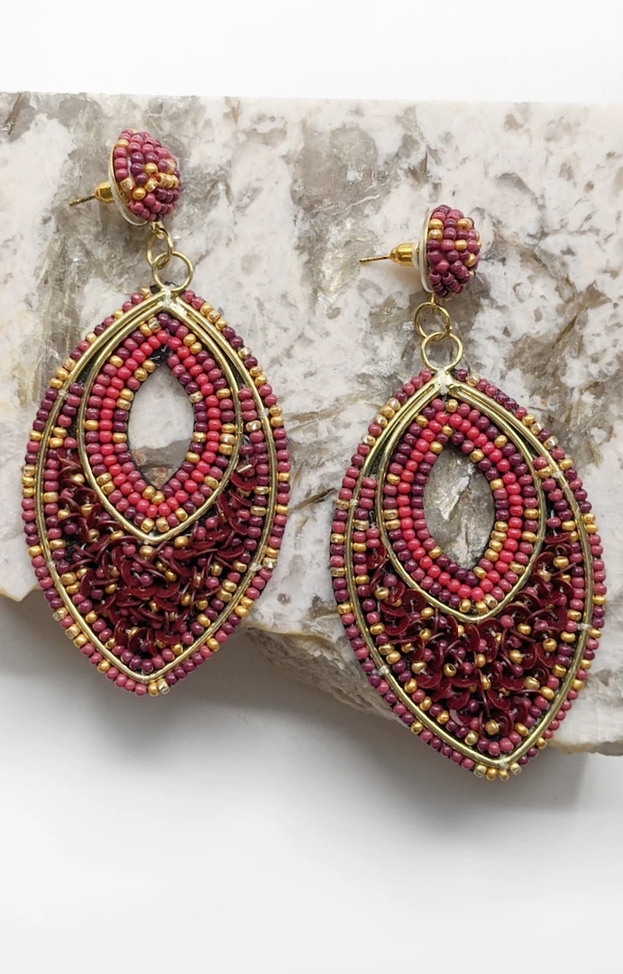 These gorgeous beaded earrings are sure to be your new favorites! We love the unique shape and beaded design setting these apart from the rest! Snag these with our burgundy sweater for a look sure to have heads turning!Â
