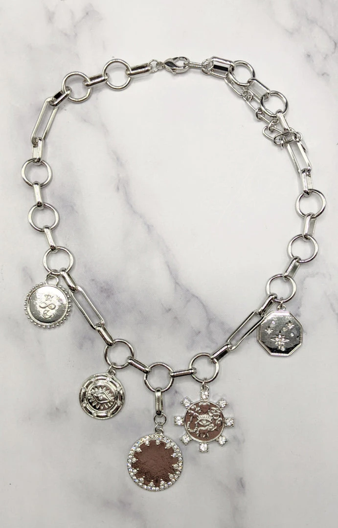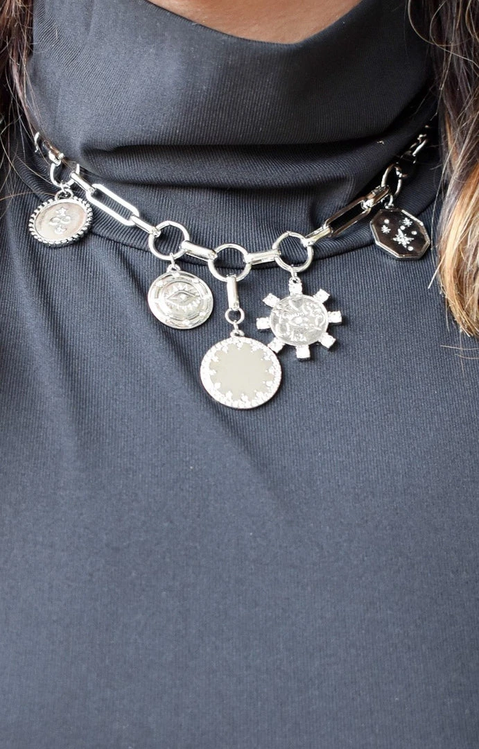 This little silver necklace is our new go-to accessory! We love the dainty chain design with the multi charm details lining the trim giving this such a statement making look! You will love rocking this necklace every chance you get this season!Â