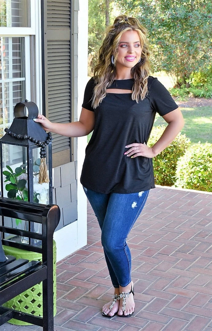 We love a fabulous top with unexpected details to set it apart and this one does just that! This beauty features a soft and stretchy material that flows over your shape to flatter. The cutout design along the neckline also adds a fun extra touch. Grab this one up and enjoy the endless pairing options it brings.