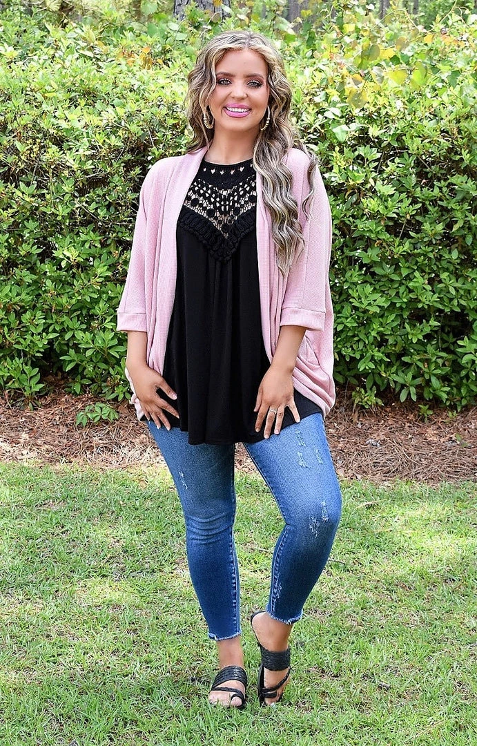 Layer in the most comfy and cutest way ever this season with our new rose cardigan! This little cardigan runs true to size with a stretchy and more open cut design. The material features a waffle knit style to give it more of a textured pop. You are going to love layering with this one!