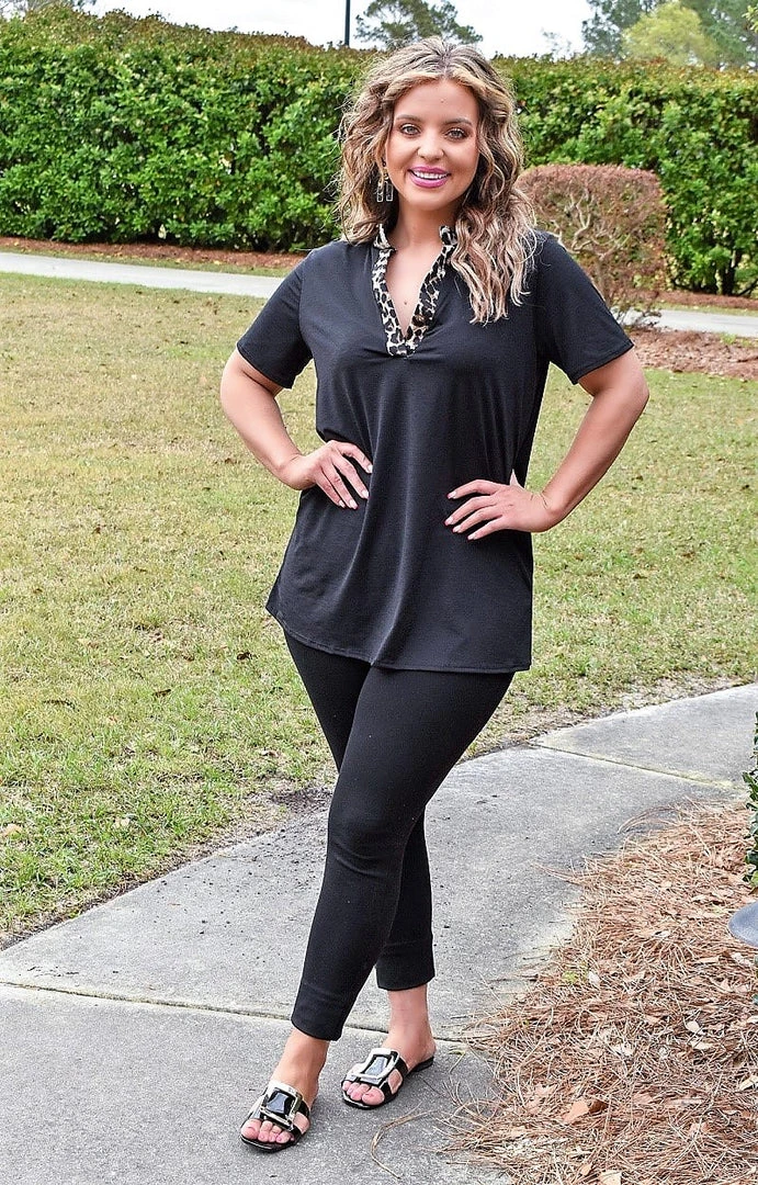 We love a little solid with pops of detailing to set it apart. This little top features leopard print accents along the neckline to add the perfect pop. This mandarin style collar on this top also has a flattering element that looks amazing on everyone. This material is soft and stretchy to glide over your shape to flatter. Grab this one up before it’s gone!
