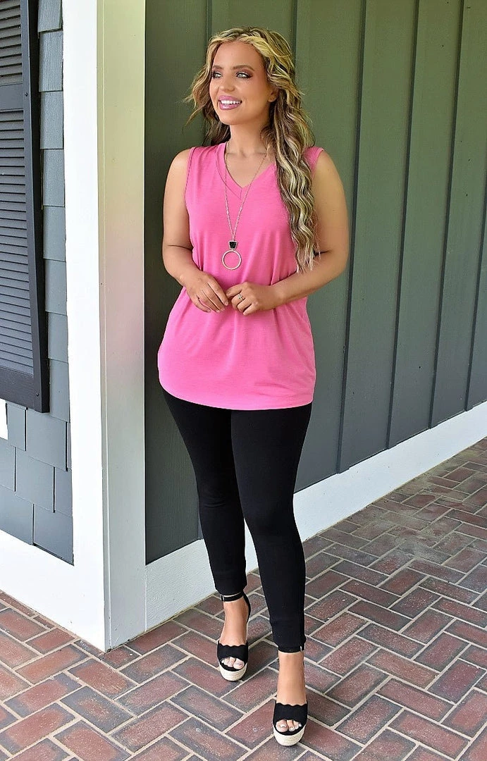 This tank is perfect for layering or rocking by itself. This top has a breathable and stretchy material that is so comfy for your next everyday look. The v-shaped neckline opens up the bust to flatter, while the cut of this one flows over your shape ensuring not to cling to any area. You are going to love this tank!