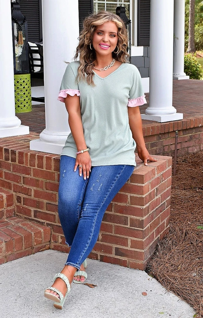 The cutest little spring must have top is here and begging to be added to your closet! We love the mint color throughout the bodice with the pink ruffle detail along the sleeves adding the perfect pop! This is very light weight and perfect for all your casual days ahead! Don’t miss out on making this little stunner yours!Â