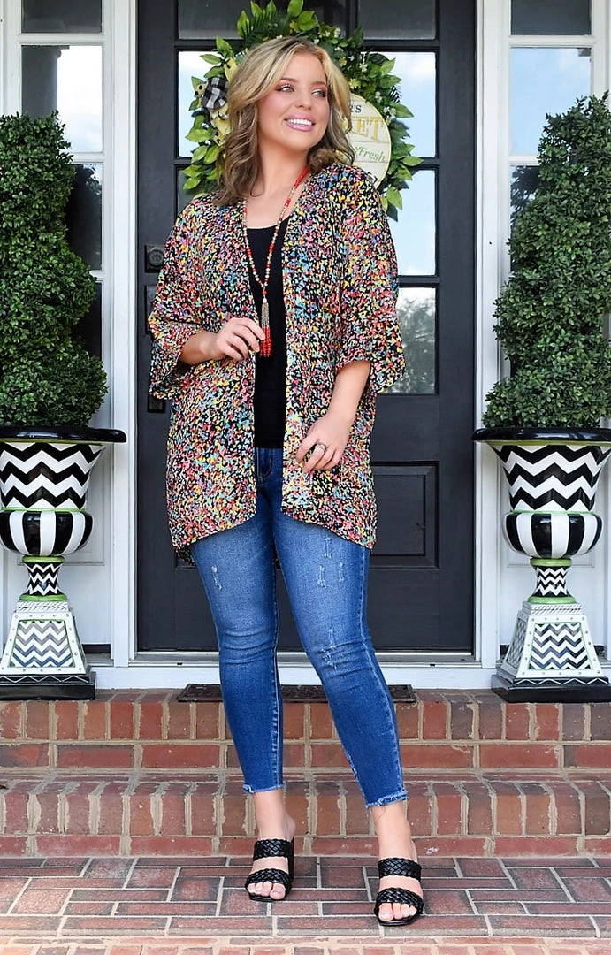 Get ready to layer in style with our favorite go to kimono! This kimono features a bold and vibrant print with fun colors to make your look stand out in style. This one features a lightweight design with a more open cut for comfort. Throw this on with your favorite go to looks and get ready to create so many trendy, layered outfits this season!