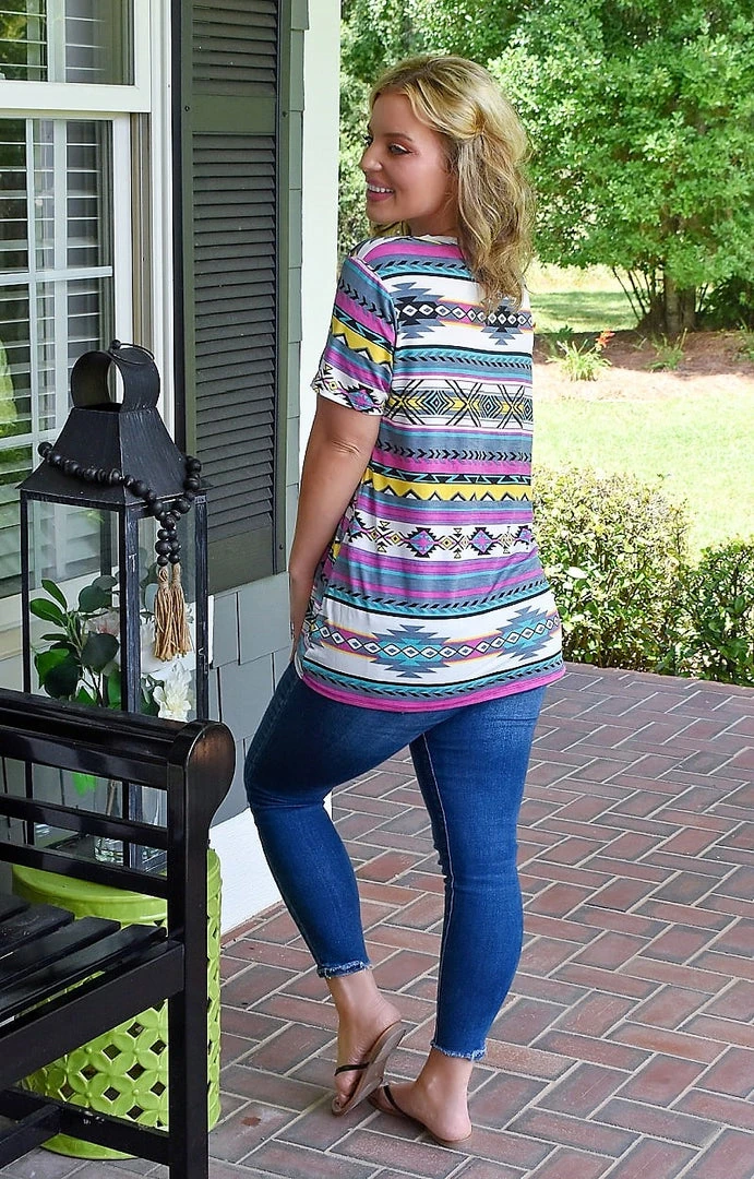 This fun top features such a comfy material that flows over your shape with a true to size cut. The bright aztec style print brings on an edgy pop. Throw this on with your favorite jeans and accessories and get ready to take your casual to the next level!