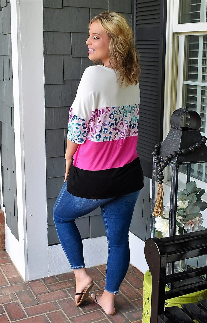 How fun and colorful is this adorable little top? This beauty features pops of pinks and leopard print to make it stand out in the most bold way. This material is so soft and stretchy with the most comfy fit ever. Throw this on with your favorite jeans and get ready to take casual to the next level this season.