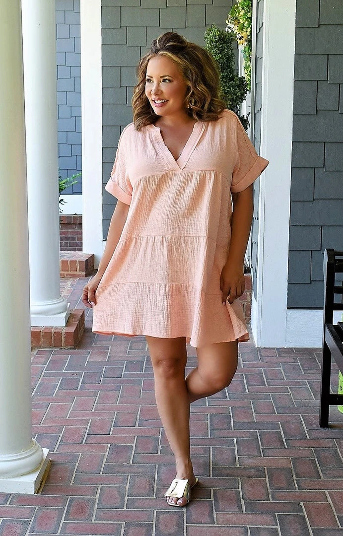 Stay peachy with this little dress this summer season! We love the open cut design sure to flatter any shape! There is no stretch to the overall material however because of the open cut design it runs very true to size. This has a mandarin style neckline with slightly belled sleeves truly setting this dress apart from the rest! You will love the endless options this dress has to offer! Hurry and make it yours!Â