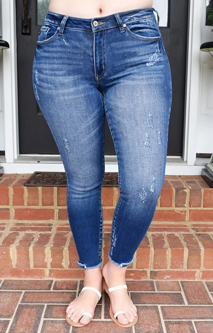 This jean comes in a faded deep blue wash with whiskering and light distress from front to back. With a mid-rise design and raw frayed hem, it’s a modern take on a favorite ankle skinny fit. Made to have just enough stretch so you can work it while wearing it comfortably.
