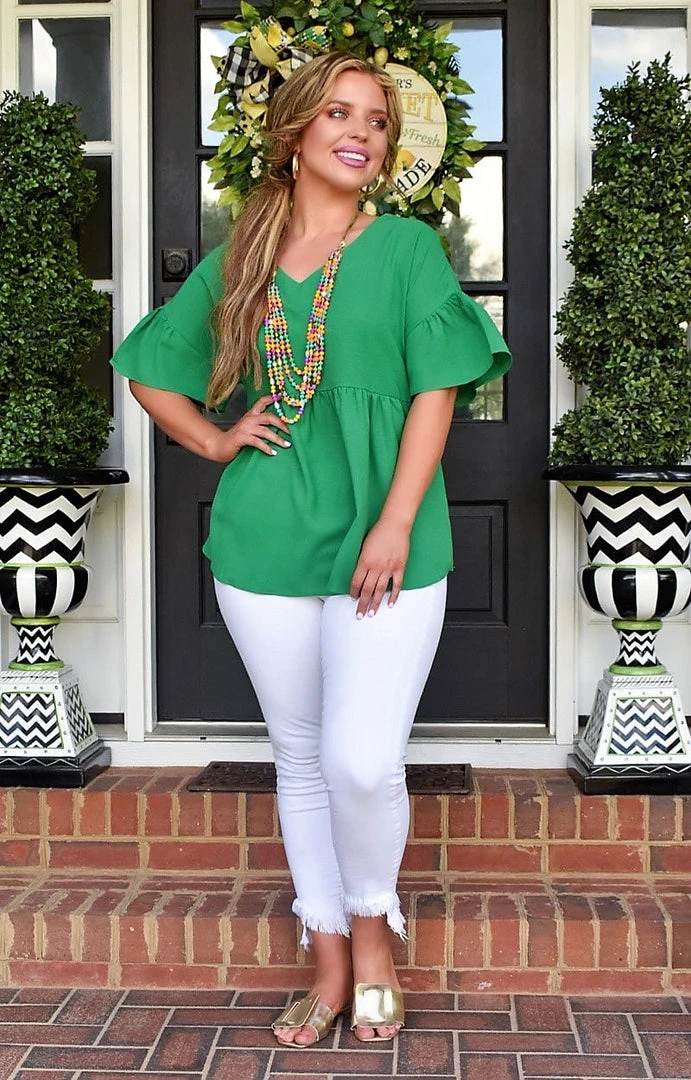 This top is just what you need to turn heads this season. It brings endless pairing options as well. This one has no stretch in the overall material, but does have a more flowing cut to flatter your shape. The sleeves have a more open cut design to add a fun pop. You are going to love this the moment you put it on!