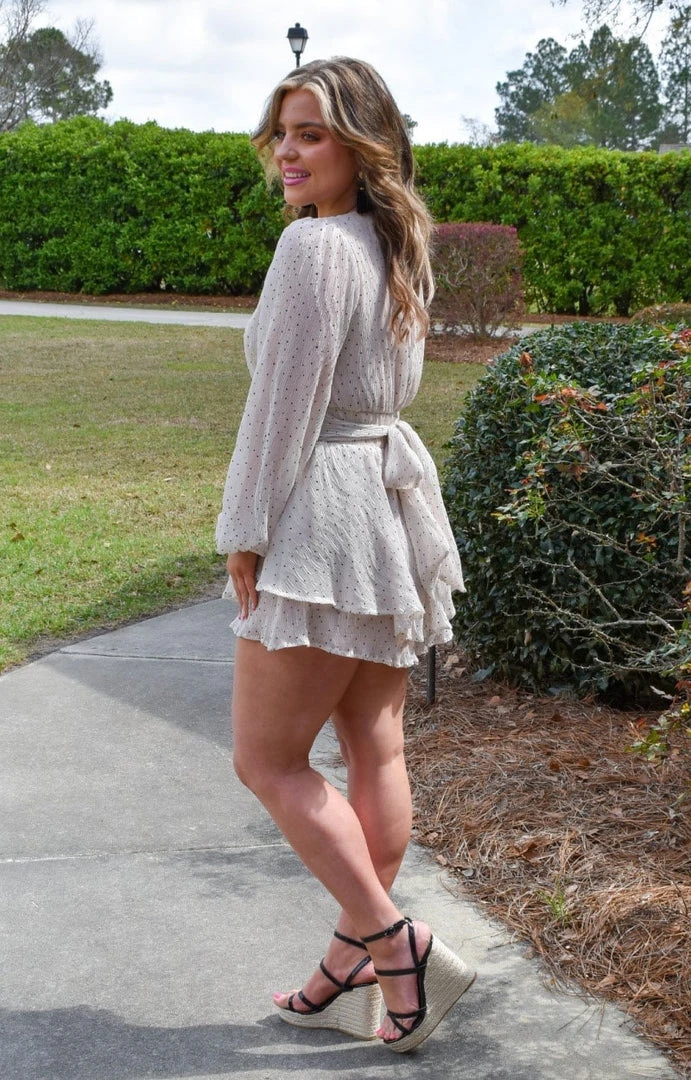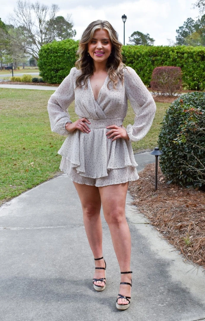 This little print romper is just what you need to rock for girl’s night or even date night! It features a more open cut bust line that flatter your shape as the waistband cinches in your look. The shorts on this romper are more open and flowing as well which we love. This romper does feature an invisible zipper design along the back with a thicker elastic style waist band in the back also. Grab yours up and get ready to turn heads all season!