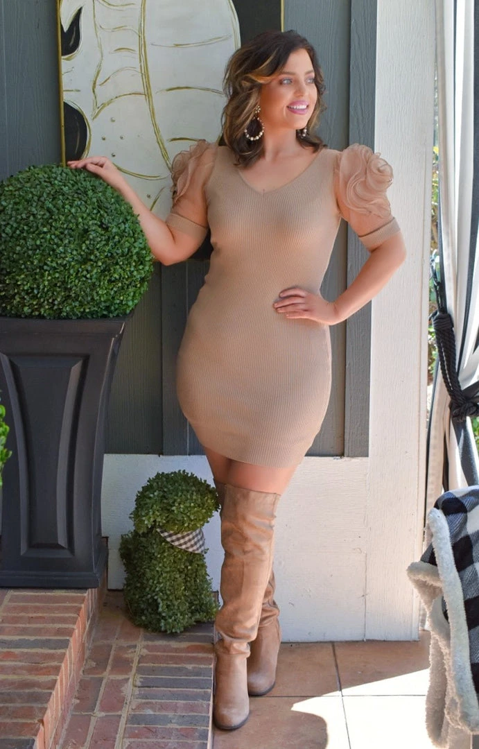 We are swooning over this stunning dress! It features a ribbed style design in the material that gives it that textured pop. We are obsessed with the sleeve detailing with the embroidered floral accents to make it stand out. Be sure to grab our must have taupe boots to truly add the final statement making touch!