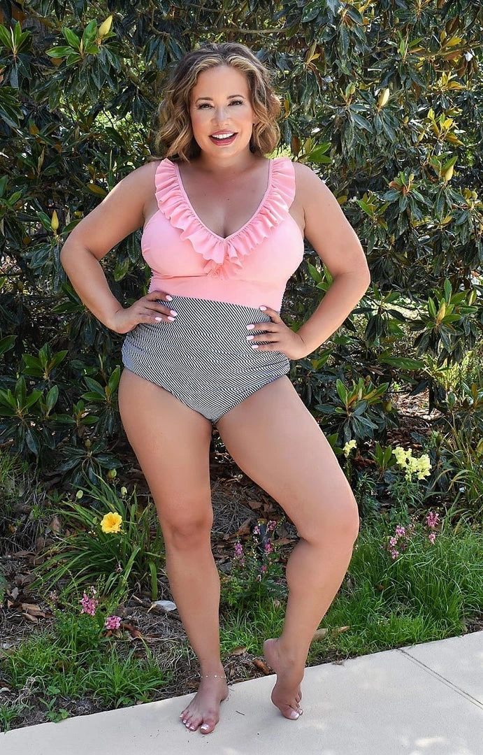 The most adorable and flattering swimsuit is here and calling your name! This one features a contrasting design with a solid coral on top and a striped detailing on bottom. The neckline features a ruffle accent with a plunging style to flatter the bust. You are going to love the flattering cut of this one the moment you put it on!