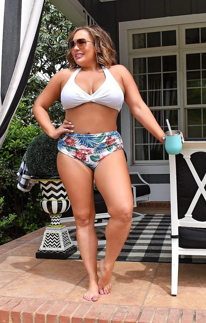 Get tropical this season with this adorable two piece swimsuit! This beauty features a white bikini top that is so versatile for pairing with almost any bottom, giving endless options! The bottoms feature a slight high rise cut that is sure to flatter the mid section with a bold tropical pattern throughout. Grab yours and enjoy looking fab by the water this Summer!
