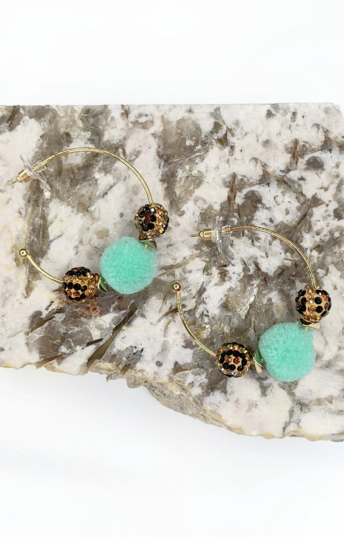 The cutest statement earrings are here and begging to be added to your closet! We love the gold hoop design with the leopard beaded details and the cutest mint pom pom detail lining the trim! You will love rocking these little earrings every chance you get!Â