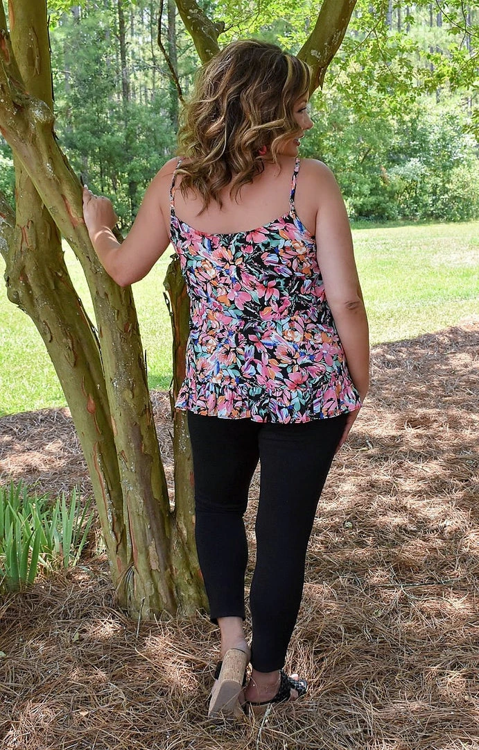 This little floral print top is just what you need for your next go to look! It features bright. bold colors against a black background and ruffles along the front that add the perfect little pop. It also has adjustable straps to customize the length to your personal preference. You are going to love this one!