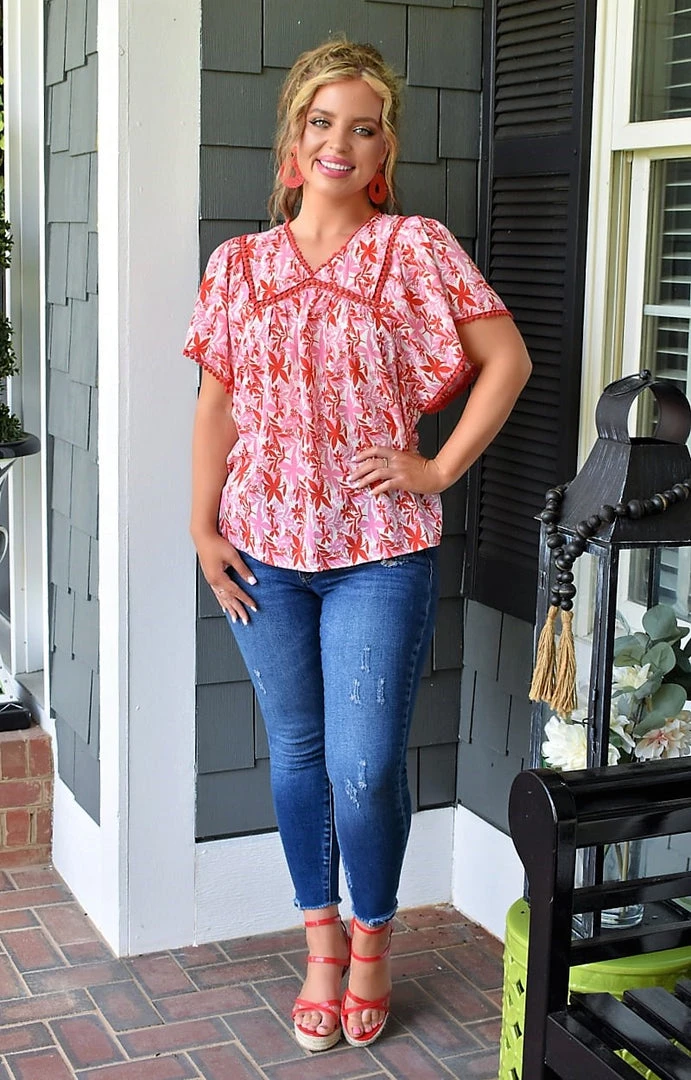 There is so much to love about this vibrant red and pink floral top! This stunner runs true to size with no stretch to the overall material. We love the rivet embroidered details lining the neckline and trim of the sleeves adding such a fun flare! Make this must have yours and enjoy all eyes on you!Â