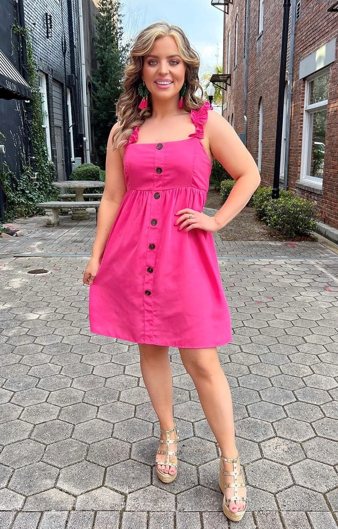 Calling all sassy girls! This little fuchsia dress is everything you need to turn heads this season! It features button detailing along the front with the cutest ruffle straps to give it that girly pop.