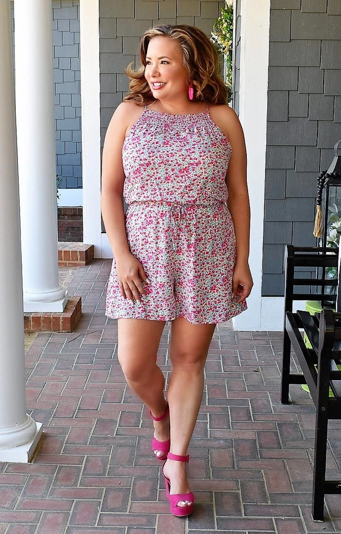 Stay girly and cute all season long with this floral print romper! This one features an elastic style waistband that cinches in your shape for that hourglass illusion. The shorts also feature a more modest length making it appropriate for a variety of settings. You are going to love this one!