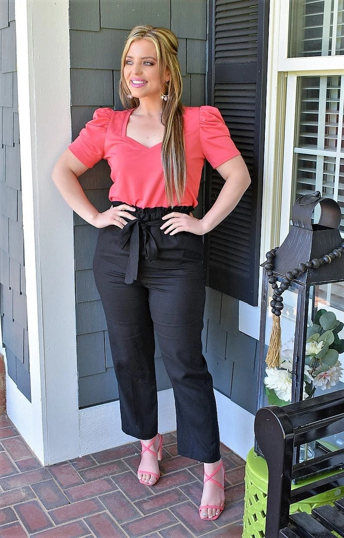 Looking for the most amazing go to solid top that can easily be made casual or more dressy? We totally have you covered with everyone’s favorite puff sleeved stunner! This top features a watermelon color that pops beautifully when paired with our new black dress pant. We are obsessed with the cut and neckline that opens up the bust while the overall design flatters and showcases your figure. You are going to love this top!