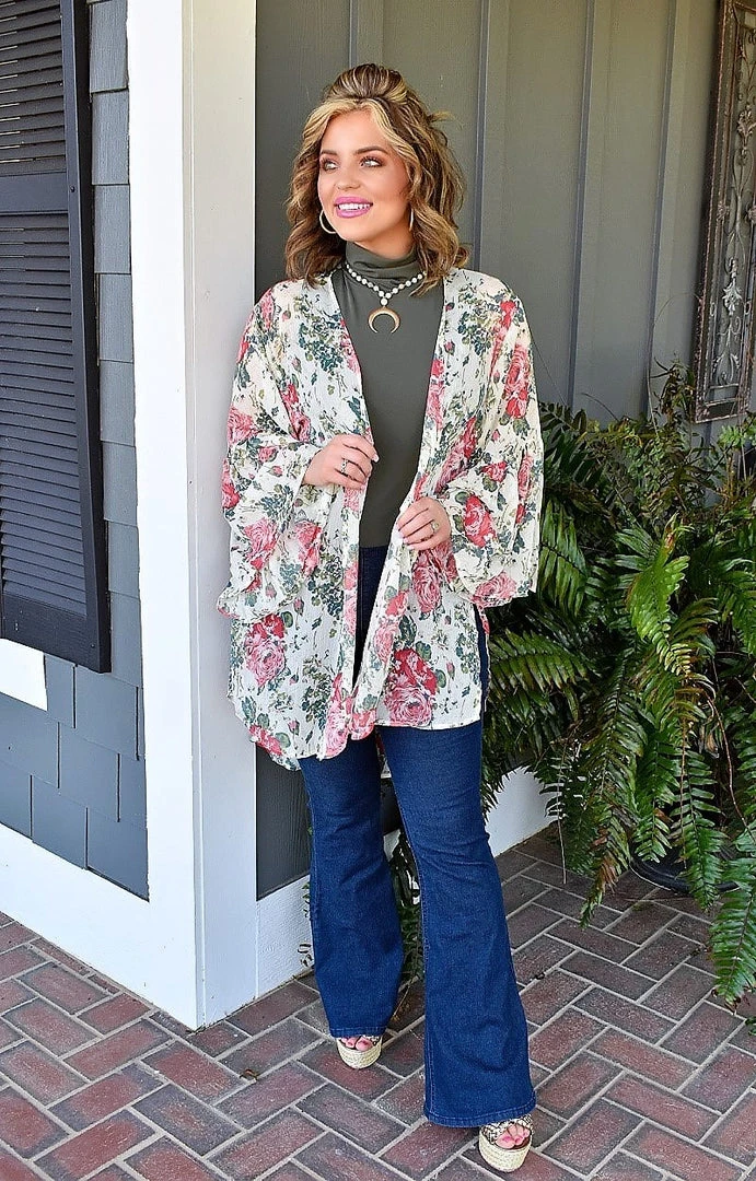 Every girl needs a go-to kimono for Spring and Summer and this stunner is just that! We love the soft floral print throughout this one! This is light weight and perfect for layering throughout the warmer months ahead! You will love rocking this over all your go-to dresses tops and tanks this season!