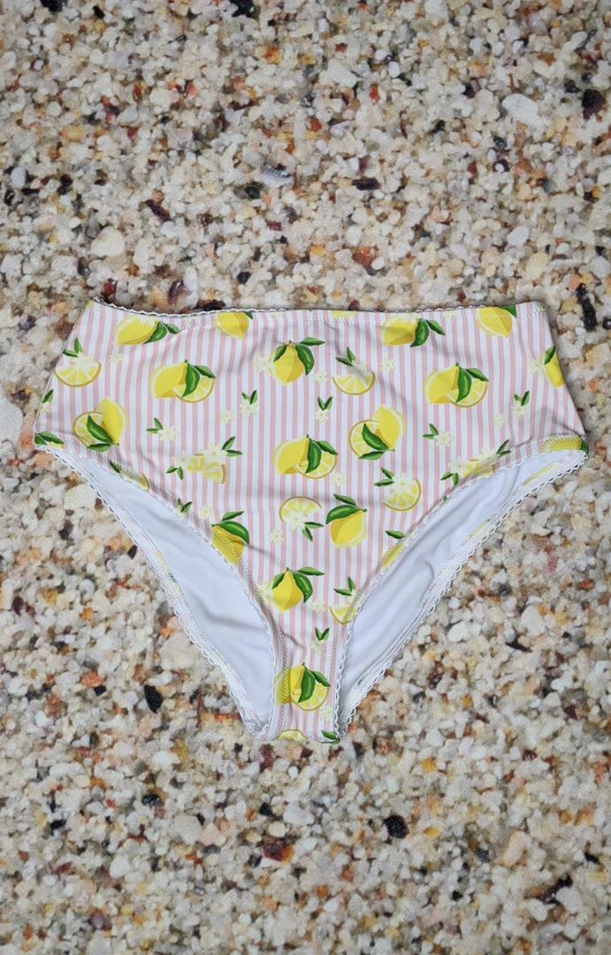 Vintage swim at its absolute best, this bikini bottom is a retro swim perfection! A print of lemons dance throughout that beautiful light pink and white stripe backdrop that stands out in vintage vibrance in fully mesh lined comfort and trimmed in white lace scallops. Take things to flirty vintage heights this summer, gals!