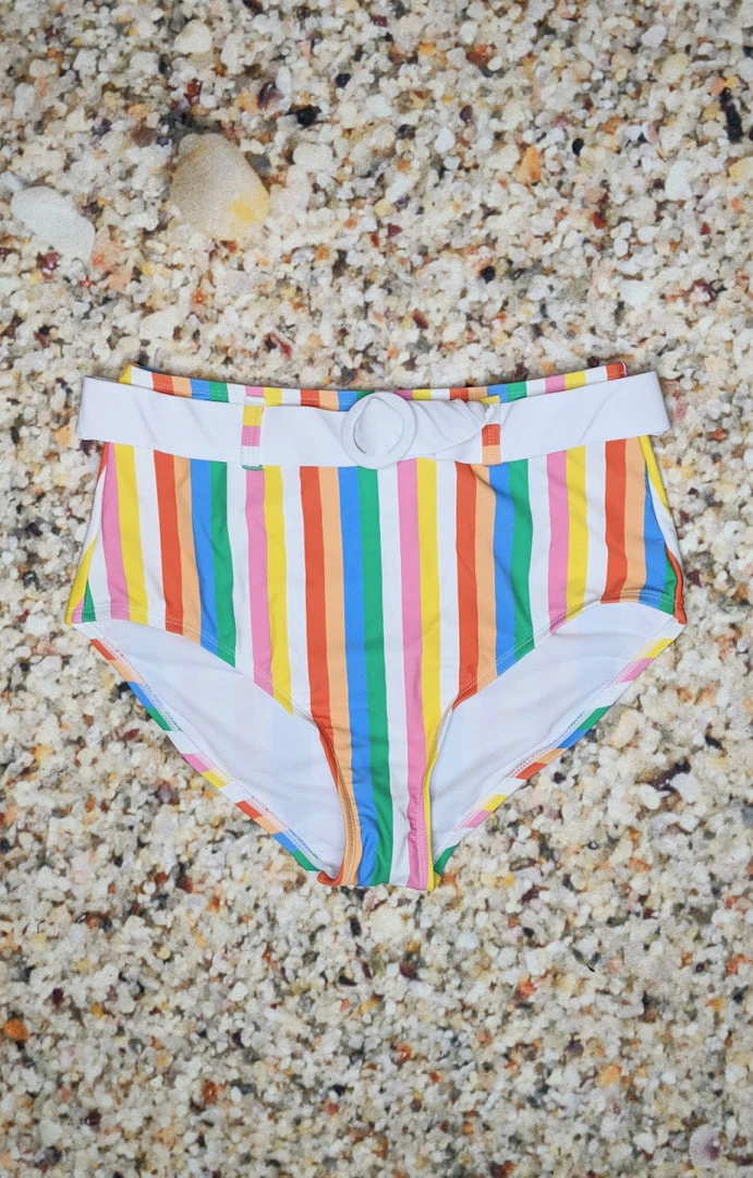 There’s more to sea, gals! Secure your pin-up silhouette to these fabulous bikini bottoms and take a stroll on the pleasure pier. Featuring a delightful rainbow stripe pattern throughout the high waisted design, this adorable bikini bottom boasts a stunning retro belt to flatter your posing. Fully mesh lined for resort wear, it’s a fabulous addition to the seaside ambiance!