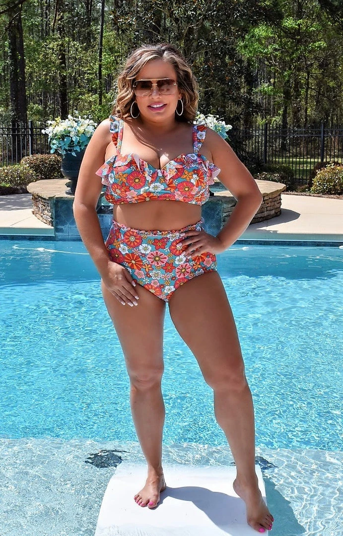Bring some summer flourish to the pool, darling! This sweet swim top boasts a groovy floral print in pink, white, and orange throughout a turquoise background. The structured design provides plenty of support with molded cups, side boning, and underwire while the adjustable spaghetti straps and lace up back provide a flattering fit. Complete with a flirty ruffle along the neckline and straps, it’s your time to thrive!