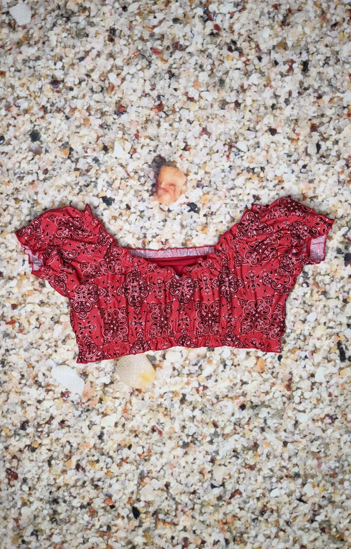 Add a feminine flare to your pin-up posing, this bikini top provides fabulous flirtation while keeping you comfortable in a playful red western bandana print. The off the shoulder neckline is highlighted with darling ruffles while the bardot sleeves lend retro accent. Suitably structured with mesh lining and an elastic banded waist to keep this crop top chic as you enjoy your laid-back point of view.