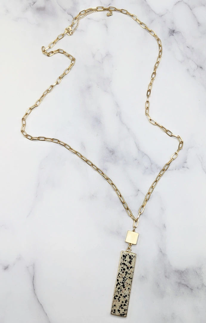 The cutest necklace ever is here and begging to be added to your accessories! We love the unique rectangle pendant shape with the natural dotted finish truly giving this necklace a look like no other! Make this yours and enjoy the endless styling options!Â